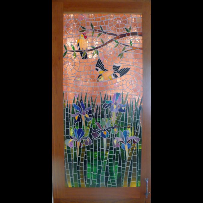 These are part of a set of glass-fronted cabinets, lit from within. These homeowners love birds and irises.