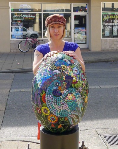 Egg sculpture covered with a Mexican folk art inspired mosaic, featuring birds, flowers, and a Tree of Life. Salvaged stained and fused glass and found objects on terra cotta were…