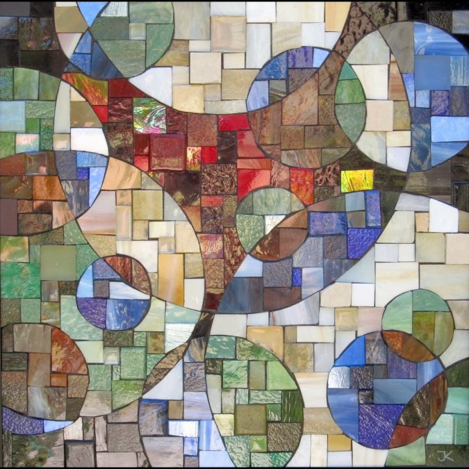 Salvaged tile and stained glass, tempered glass on wedi scrap. Part of the “Circles and Squares” mosaic series.