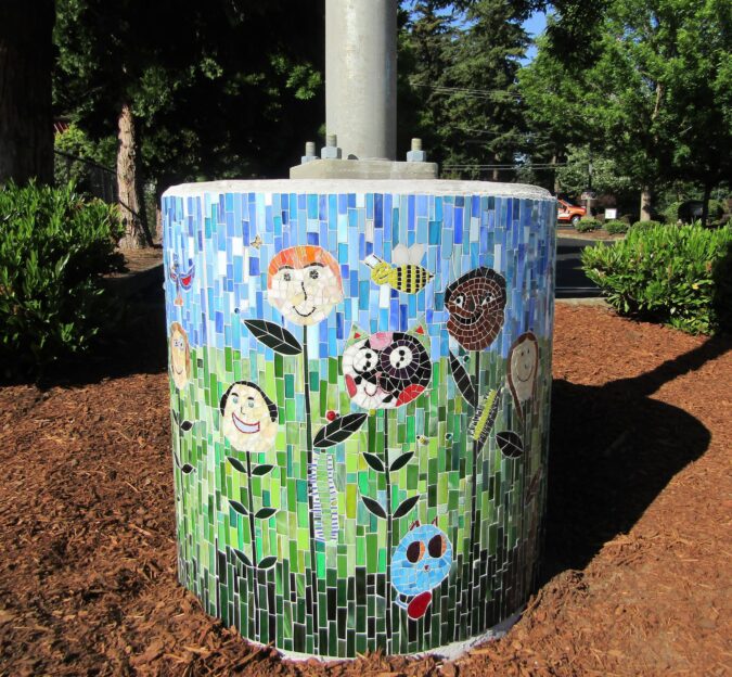 In 2009, I was commissioned to create a mosaic feature for Lawton Elementary School in Seattle, WA. I worked with the artist-in-residence, who had the kids draw scenes from life…