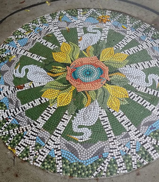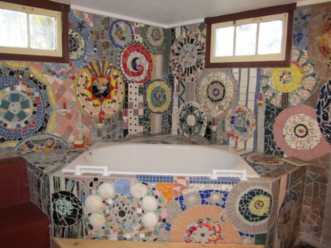 This jacuzzi room was covered in mosaic by about 20 people over 3 months. I came in for the first day to show everyone how to get started, and again…