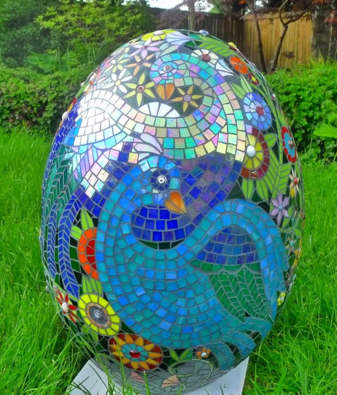 Egg sculpture covered with a Mexican folk art inspired mosaic, featuring birds, flowers, and a Tree of Life. Salvaged stained and fused glass and found objects on terra cotta were…