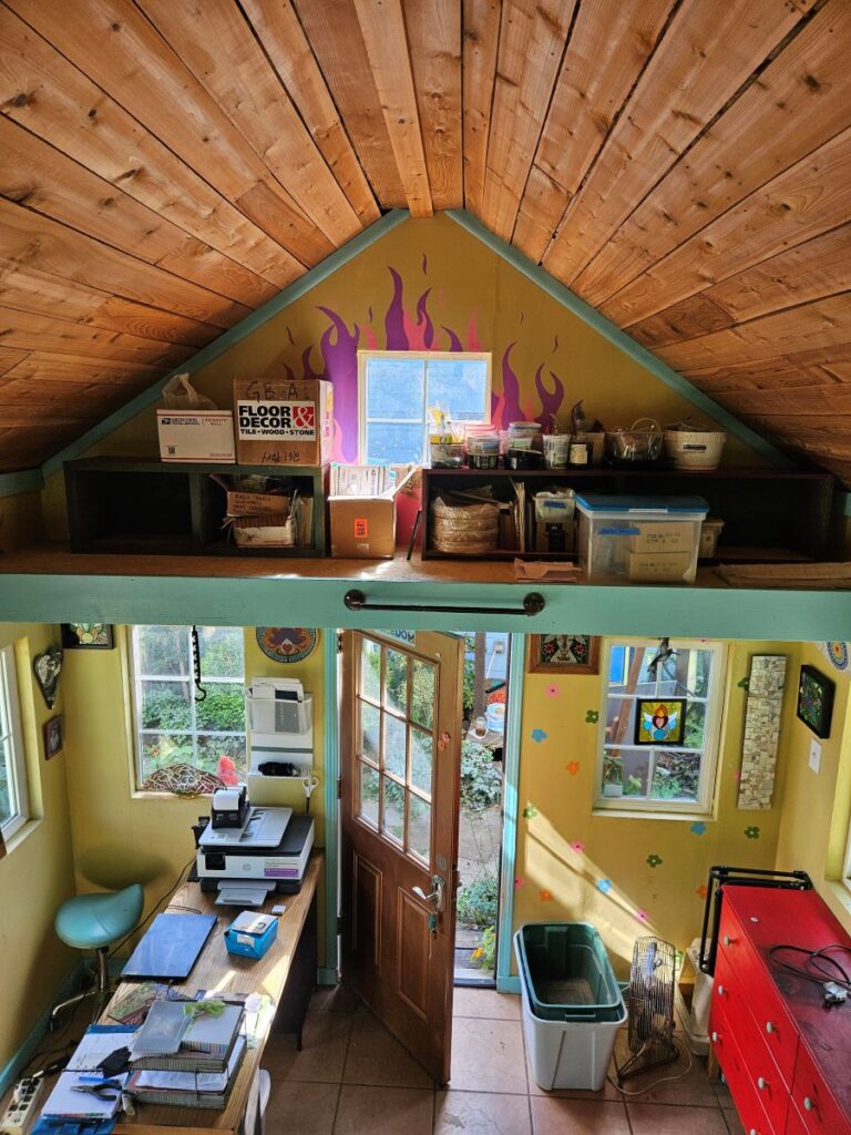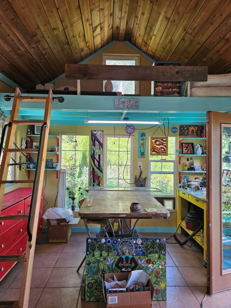 But when our daughter turned 16, we let her move into the garden studio. I thought I would be giving up the space for 2 years, certain she would choose to move out after graduation (like I did at that age.) But no, she loves it here and has no desire to live in a small apartment in the city or in shared housing. She turned 22 this spring. She’s attending college and has been working at the same job for four years, which barely pays enough for her basic expenses without rent. So, in 2024, I moved out of the big studio and into a corner of the garage while working on my largest commission to date. In summer, I spilled out into the driveway, working under a canopy. Meanwhile, Mike worked on transforming the big studio into a living space. Finally, in mid-July 2025, our daughter moved into her apartment and I am back to working in my little garden studio once again.