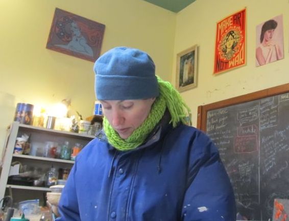 Even with a heater nearby, I worked bundled up and my fingers would be stiff with cold. Worst of all, glass actually gets brittle with cold temperatures, so I had to use a heat gun to warm the glass before cutting it. My supplies would often freeze, which can ruin them. The garden studio doesn’t have built in heat, but it’s very easy to keep it warm with a small radiant heater. I continued using the big studio for storage, messy work with cement, and for big projects.