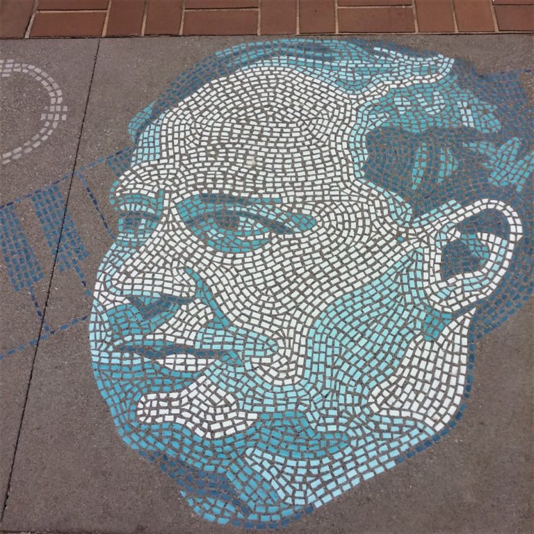 Mosaic sidewalk inlay in honor of Verne Eke in front of the Washington Center for Performing Arts in Olympia, WA for the City of Olympia. This is one of three projects memorializing important figures in the early Olympia music scene.